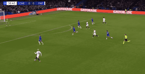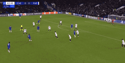 上半场补时阶段,切尔西短传渗透,哈托的小角度射门,被门将扑了出来。
