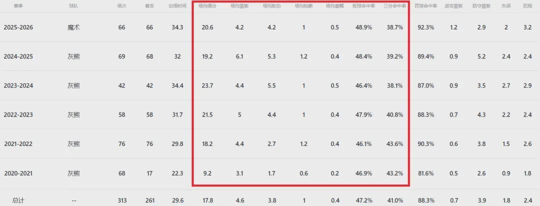 本赛季至今,贝恩为魔术出战66场,场均上阵34.3分钟贡献20.6分4.2板4.2助1断,场均以38.7%命中率扔进2记三分球。