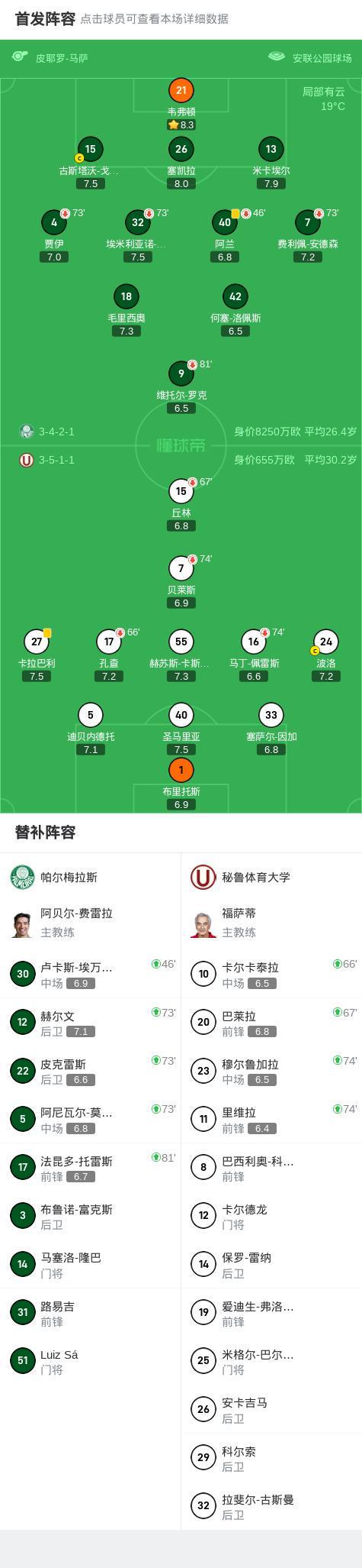 帕尔梅拉斯0-0秘鲁体育大学,势均力敌 2026-01-10 04:54:55 nba 4℃ 0 南美解放者杯1/8决赛次回合,帕尔梅拉斯对阵秘鲁体育大学的比赛在常规时间内以0比0握手言和。凭借此前建立的优势,帕尔梅拉斯以总比分4比0淘汰对手,顺利晋级下一轮赛事。球队阵容 技术统计 相关推荐 帕尔梅拉斯0-0秘鲁体育大学,势均力敌